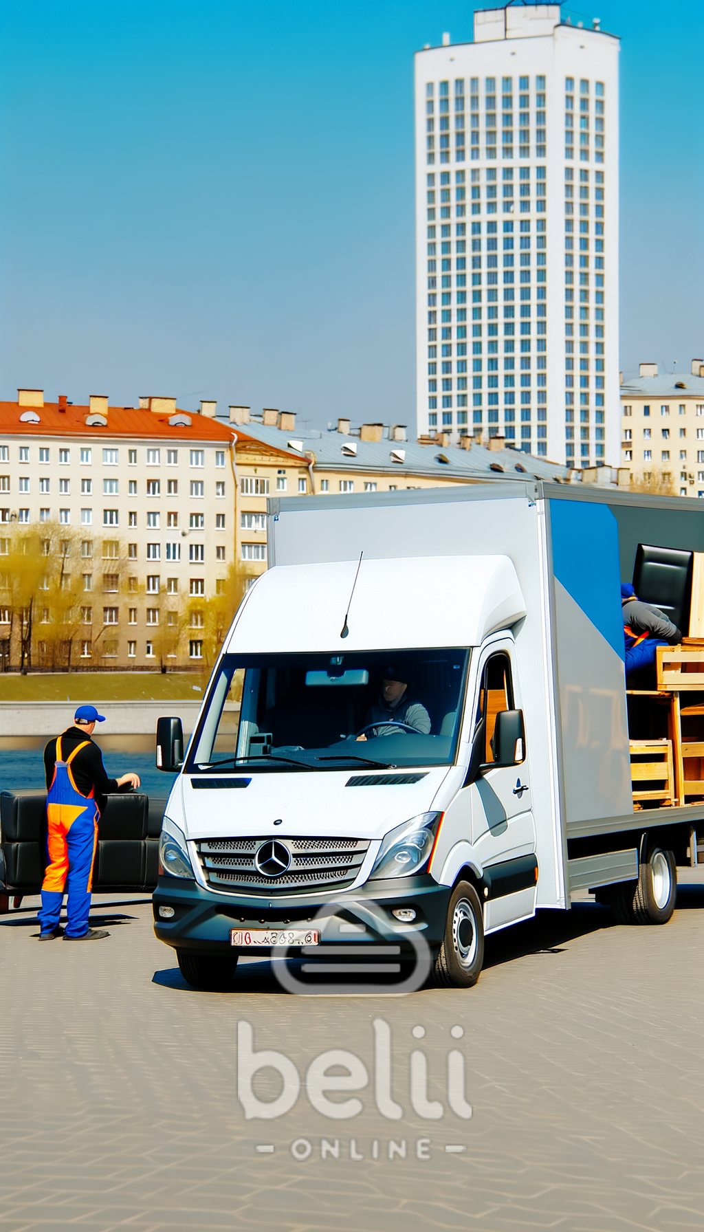 Нарисуй как компания Ваш Грузчик выполняет грузоперевозки в Минске на автомобиле мерседес спринтер (мебельный фургон), а погрузкой занимаются крепкие и ответственные грузчики.